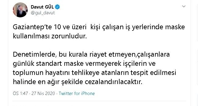 Vali Gül Sosyal medya hesabından yaptığı açıklamada yasağa riayet etmeyenlerin cazalandırılacağını belirterek, "Gaziantep’te 10 ve üzeri kişi çalışan iş yerlerinde maske kullanılması zorunludur. Denetimlerde, bu kurala riayet etmeyen,çalışanlara günlük standart maske vermeyerek işçilerin ve toplumun hayatını tehlikeye atanların tespit edilmesi halinde en ağır şekilde cezalandırılacaktır" ifadelerine yer verdi.