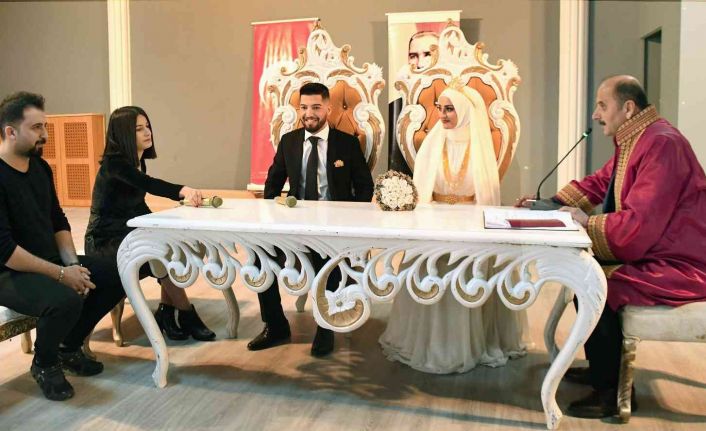 Evlilik cüzdanını gelin ve damada teslim eden Belediye Başkanı Hasan Doğru’ya genç çift ile Altun ve Ekinci ailesi teşekkür etti.