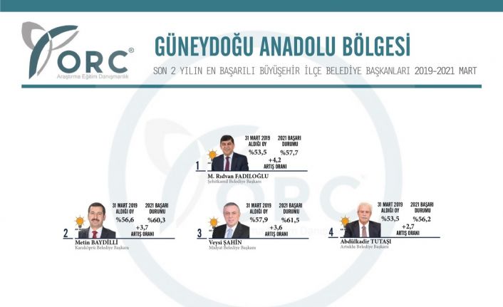 ORC Araştırma Eğitim ve Danışmanlık Şirketi, ‘Yerel Yönetimler Performans Araştırması Son 2 Yılın En Başarılı Belediye Başkanları’ başlıklı araştırmasının sonuçlarını kamuoyuna duyurdu. Araştırma, 19 Mart-07 Nisan 2021 tarihleri arasında 30 büyükşehirde, 25 bin seçmenin üzerindeki tüm ilçelerde toplam 27 bin 160 kişi ile yüz yüze ve CATI yöntemiyle gerçekleştirildi. En başarılı belediye başkanları listesinde 31 Mart 2019 yerel seçimlerinde almış olduğu oydan daha fazla başarı oranına sahip olan büyükşehir ilçe belediye başkanları yer aldı.