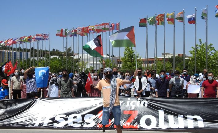 İsrail’in Kudus’e saldırılarına sessiz kalan ülkeler Gaziantep’te 200 gencin sessiz eylemi ile protesto edildi. 200 farklı ülkeyi temsil eden gençler, ağızlarını bantlayarak Filistin’e destek verdi.