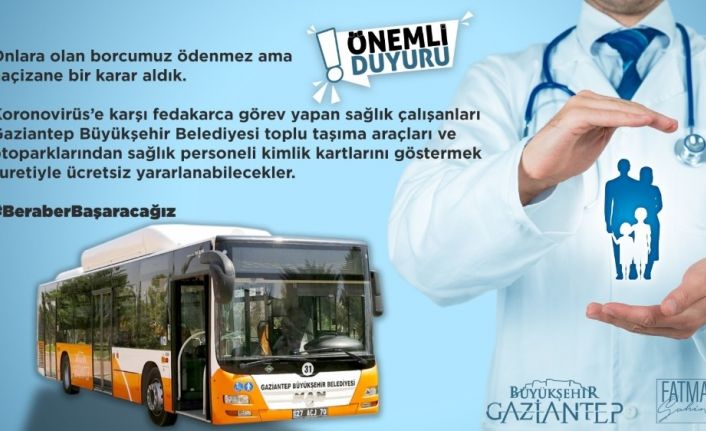 Gaziantep Büyükşehir Belediye Başkanı Fatma Şahin, korona virüs (COVID-19) salgınına karşı gece gündüz mücadele eden ve insan sağlığı için yoğun mesai harcayan tüm sağlık çalışanlarının Büyükşehir Belediyesi’ne bağlı toplu taşıma araçlarında ve otoparklarında sağlık personeli kimlik kartlarını göstermeleri halinde ücretsiz yararlanabileceğini açıkladı.