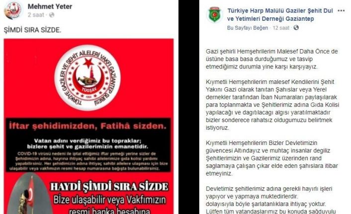 Türkiye Harp Malulü Gaziler Şehit Dul ve Yetimleri Derneği Gaziantep Şubesi şehitler adına ramazan ayında gıda kolisi dağıtmak için bağış kampanyası başlatan derneğe tepki gösterdi. Gaziler ve Şehit Aileleri Vakfı Gaziantep Şubesi’nin başlattığı kampanyayı doğru bulmadıklarını belirten Dernek Başkanı Cabbar Cücük, konuya ilişkin yazılı açıklama yayınladı. Açıklamada daha önceden üzerinde durdukları ve tasvip etmedikleri bir durumla tekrar karşı karşıya kaldıklarını aktaran Cücük, “Kendisini şehit yakını gazi olarak tanıtan şahıslar ile yerel derneklerin İBAN numarası paylaşarak para toplamasından son derece rahatsızız” ifadelerini kullandı.