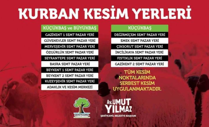 Şehitkamil Belediye Başkanı Avukat Umut Yılmaz, ilçede belirlenen kurban kesim yerlerini açıkladı ve vatandaşları, kurban kesim yerlerinin dışında kesim yapmamaları konusunda uyardı.