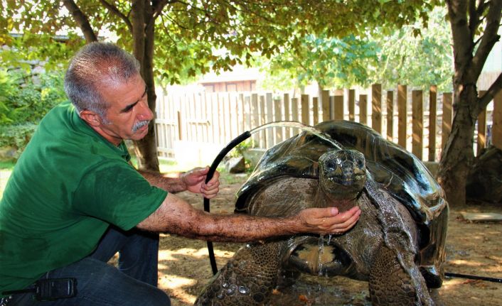 Kocaeli’nin Darıca ilçesinde bulunan Faruk Yalçın Hayvanat Bahçesi’nde sıcaktan bunalan hayvanlar buzlu meyvelerle serinleyip, bakıcılarının kendilerini ıslatmasıyla keyifli vakit geçiriyor. 101 yaşındaki kaplumbağa da hortumla serinlemenin keyfini sürüyor.