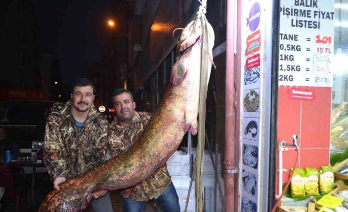 Meriç Nehri’nde balıkçıların oltasına takılan ve 5 kişi tarafından zor yakalanan 2 metreye yakın 90 kiloluk yayın balığı, Çorlu Şeyh Sinan Mahallesi Şehit İrfan Atasayar Sokak üzerindeki bir balıkçıda tezgaha konuldu.