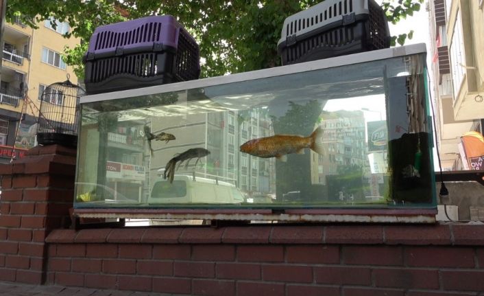 Dükkan dışında bulunan akvaryumda yaşayan koi balığını görenler akvaryumu bir süre izledikten sonra yollarına devam ediyor.