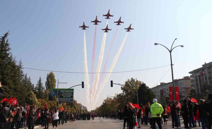 Eskişehir’de cumhuriyetin ilan edilişinin 98’inci yıldönümü, yüzlerce vatandaşın katılımıyla düzenlenen törenle kutlandı. Törende Türk Yıldızları selamlama uçuşu yaptı.