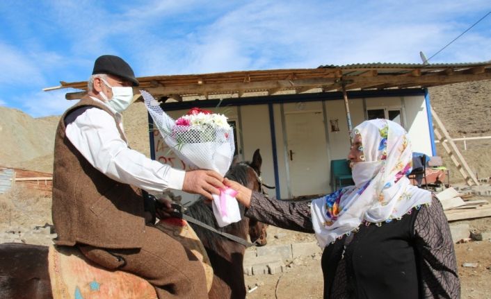 Oltu ilçesinin Şehitler Mahallesi’nde besicilik yapan 8 çocuk babası Abdullah Başar (62), Sevgililer ünü sebebiyle eşi Ayfer Başar’a (60) sürpriz yaptı. İlçe merkezinde bir çiçekçiye giden Başar, bir buket çiçek alarak ilçe merkezinden 3,5 kilometre uzaklıktaki ahırın yolunu tuttu. Başar, at sırtında getirdiği çiçeği ve altın künyeyi eşine vererek 14 Şubat Sevgililer Günü’nü kutladı.