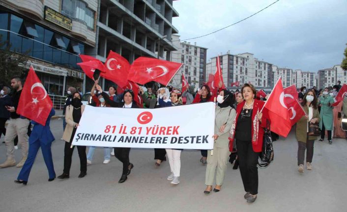 Şırnak Cumhuriyet Meydanı’nda toplanan grup “81 il 81 yürek Şırnaklı annelere destek” pankartıyla ve ellerinde Türk bayrakları yürüyüş yaparak terör örgütü PKK’ya ve HDP’ye tepkilerini dile getirdi. Kadınlar sık sık ’Kahrolsun PKK’, ’Şehitler ölmez vatan bölünmez’, ’Kahrolsun PKK, işbirlikçi HDP’ ve ’Kürt Türk kardeştir, PKK kalleştir’ sloganları attı. Yürüyüş, lise caddesinden devam ederek belediye önünde son buldu.