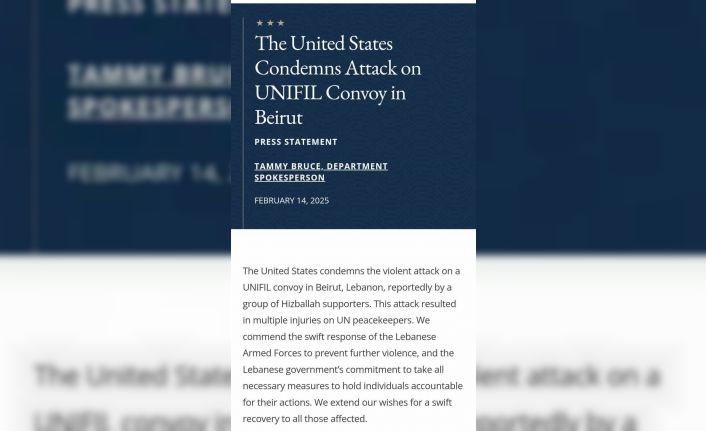 ABD Dışişleri Bakanlığı, Hizbullah destekçisi bir grubun Lübnan’ın başkenti Beyrut’ta Birleşmiş Milletler Lübnan Geçici Barış Gücü (UNIFIL) konvoyuna yönelik gerçekleştirdiği saldırıyı kınadı.