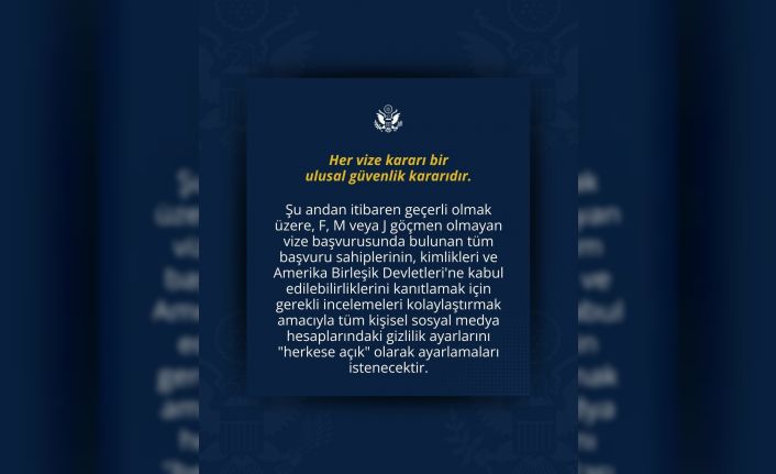 "Şu andan itibaren geçerli olmak üzere, F, M veya J göçmen olmayan vize başvurusunda bulunan tüm başvuru sahiplerinin, kimlikleri ve Amerika Birleşik Devletleri’ne kabul edilebilirliklerini kanıtlamak için gerekli incelemeleri kolaylaştırmak amacıyla tüm kişisel sosyal medya hesaplarındaki gizlilik ayarlarını ‘herkese açık’ olarak ayarlamaları istenecektir."