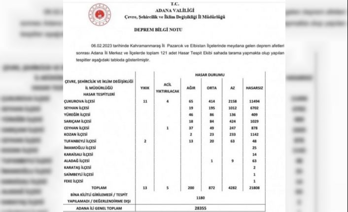 Adana Çevre Şehircilik ve İklim Değişikliği İl Müdürlüğü, 121 hasar tespit ekibi ile kent genelinde tarama çalışmalarını sürdürüyor. Depremde 13 binanın yıkıldığı Adana’da ekipler, çalışmalar çerçevesinde 27 bin 180 bina inceledi. Bunlardan 5’inin acil yıkılması yönünde karar alındı. İncelemede binaların 200’ü ağır hasarlı, 872’si orta hasarlı, 4 bin 282’si az hasarlı, 21 bin 808’i hasarsız olarak tespit edildi. Bin 180 binada ise bazı nedenlerden tespit yapılamadı.