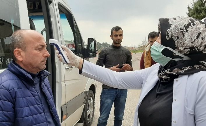 Korona virüsüne karşı Adıyaman’ın giriş ve çıkışlarında araçlar durdurularak sürücü ve yolcuların ateşi ölçülüyor.