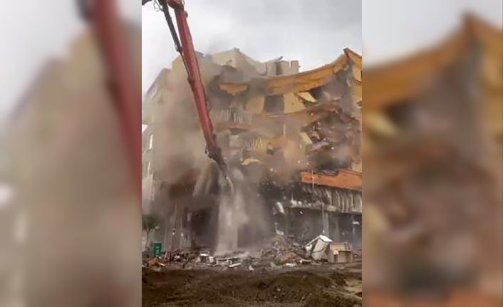 Elazığ’da 6 Şubat’ta Kahramanmaraş merkezli depremlerde ağır hasar gören binaların yıkımı devam ediyor. Bosna Hersek Bulvarı’nda bulunan 6 katlı binanın da çevre güvenliğinin alınmasının ardından yıkımına başlandı. Yıkım sırasında bina bir anda çöktü. Ortalık toz bulutu ile kaplanırken, olayda ölen ya da yaralanan olmadı. O anlar cep telefonu ile görüntülendi.