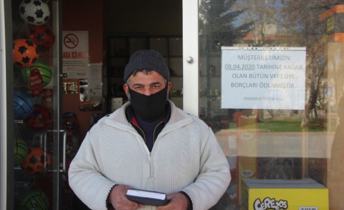 Kayseri’nin Melikgazi ilçesinde geçtiğimiz günlerde bir bakkala gelen hayırsever, veresiye defterindeki borçları ödemek istediğini söyledi. Bakkal sahibi Fatih Coşkun, gelen talep üzerine neye uğradığını şaşırarak, hayırseveri tanımak istedi. Kimliğini gizleyen hayırsever, veresiye defterindeki borçları kapattıktan sonra sırra kadem bastı. Bakkal sahibi Coşkun da, bu kararı bakkalının camına yazdığı ’Müşterilerimizin 08.04.2020 tarihine kadar olan bütün veresiye borçları ödenmiştir. Kimsenin borcu yoktur’ yazılı döviz asarak, müjdeli haberi mahalle sakinleri ile paylaştı.