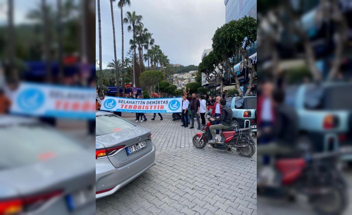 İstanbul Büyükşehir Belediye Başkanı Ekrem İmamoğlu’nun Alanya’daki miting seçim otobüsüyle giriş yaptığı sırada bir grup ülkücü, ’Selahattin Demirtaş teröristtir’ yazılı pankart açarak bozkurt işareti yaptı. Slogan atan grup, seçim otobüsünün geçişinin ardından sessizce dağıldı.