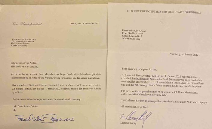 Almanya Cumhurbaşkanı Frank-Walter Steinmeier ve Nürnberg Büyükşehir Belediye Başkanı Marcus König, Türk kökenli Arslan çiftinin 65’inci evlilik yıl dönümünü mektup ve çiçek göndererek kutladı.