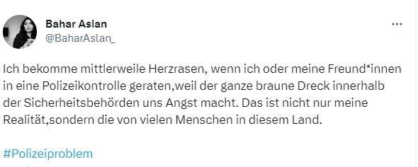 Almanya’nın Gelsenkirchen kentinde Polis Yüksek Okulu’nda “kültürlerarası yetkinlik" dersleri veren Bahar Aslan, medya hesabında bazı polislerin yabancılara karşı uyguladığı şiddeti dile getirince işten çıkarıldı. Aslan’ın “Almanya’da aşırı sağcı polislerin göçmenlere yönelik ırkçı motifli kontroller yapılıyor. Ben ve arkadaşlarım bir polis kontrolüne yakalandığımızda kalp çarpıntısı yaşıyoruz. Çünkü güvenlik makamları içindeki tüm kahverengi pislikler bizi korkutuyor. Bu sadece benim değil, bu ülkedeki pek çok insanın gerçeği" ifadelerinin ardından görevden alındı. Aslan’ın söz konusu açıklamasının ardından Polis Akademisi tarafından yapılan açıklamada Aslan’ın iş anlaşmasının uzatılmayacağını bildirilerek, “Öğretim görevlisinin mevcut açıklamaları nedeniyle hem müstakbel polis memurlarına hem de gelecekteki idari memurlara demokrasi, hoşgörü ve tarafsızlıkla ilgili önyargısız, sağlam temellere dayanan bir görüş aktarmak için uygun olmadığı” ifadelerine yer verildi.