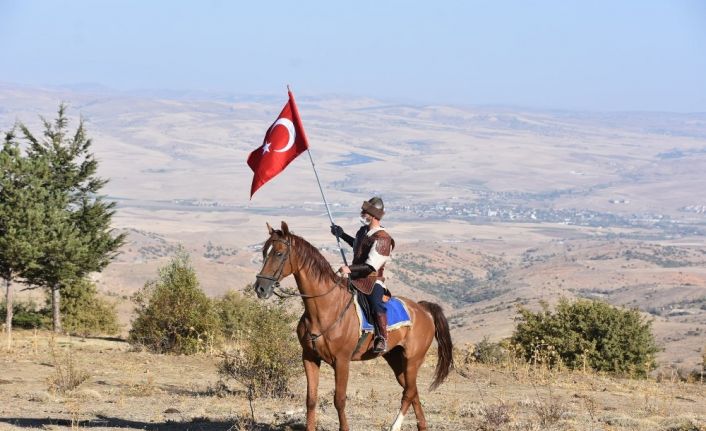 Alp kıyafetli Türk bayraklı atlılar Dinek Dağı zirvesinde