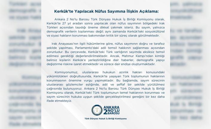 “Komisyonumuz, uluslararası hukukun azınlık hakları konusundaki yükümlülükleri doğrultusunda Kerkük’te yaşayan Türk toplumunun haklarının korunmasının önemine vurgu yapmaktadır. Bu bağlamda sayım sürecinin uluslararası gözlemciler eşliğinde adil ve şeffaf bir şekilde yürütülmesi çağrısında bulunuyoruz. Ankara 2 No’lu Barosu Türk Dünyası Hukuk İş Birliği Komisyonu olarak Kerkük’teki Türk toplumunun temel haklarının korunması ve sayım sürecinin hukuka uygun şekilde gerçekleştirilmesi gereğini bir kez daha ifade etmekteyiz.”