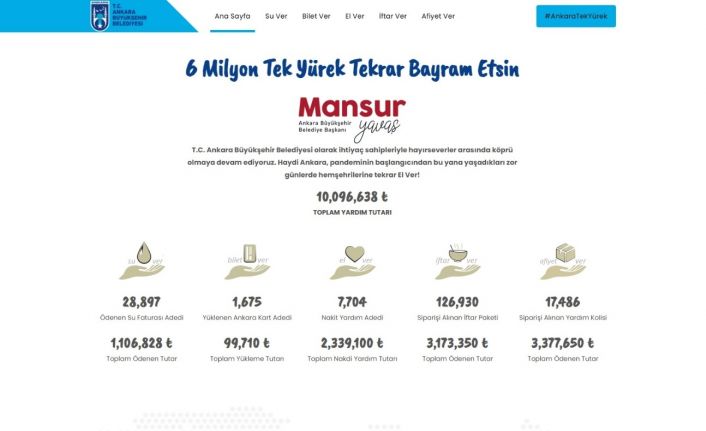 6 Milyon Tek Yürek kampanyası ile 20 günde yardım tutarı; Su Ver ile 28 bin 897 adet su faturası ödenerek, 1 milyon 106 bin 828 TL, Bilet Ver ile 1675 adet ANKARAKART’a yükleme yapılırken, 99 bin 710 TL, El Ver ile 7 bin 704 nakit yardım adedine ulaşılırken, 2 milyon 339 bin 100 TL, İftar Ver ile 126 bin 930 sipariş verilirken, 3 milyon 173 bin 350 TL, Afiyet Ver ile 17 bin 486 yardım kolisi siparişi alınırken, 3 milyon 377 bin 650 TL olmak üzere toplam 10 milyon TL’yi geçti.