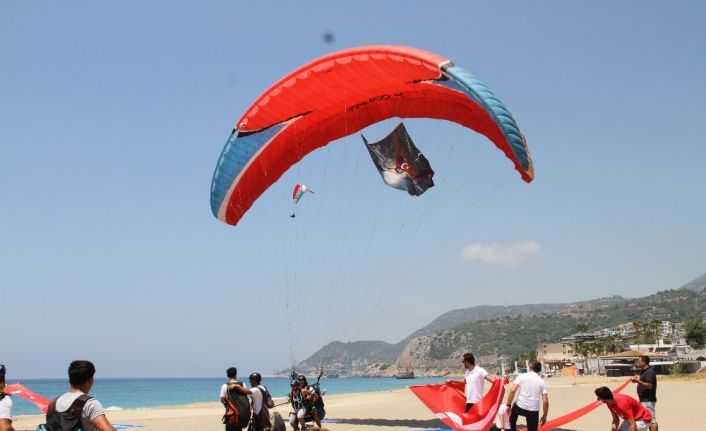 Alanya Alaaddin Keykubat Üniversitesi Spor Bilimleri Fakültesi ile Türk Hava Kurumu Alanya Şubesi ve Türk Hava Sporları Federasyonu ortaklığında 15 Temmuz darbe girişiminin 4’üncü yılında şehit ve gazileri anmak için yamaç paraşütü etkinliği düzenlendi. Deniz seviyesinden 700 metre yükseklikteki Yassı Tepe’den 6 yamaç paraşütü pilotuyla birlikte öğrenciler ve çok sayıda kişi kendilerini boşluğa bıraktı. Dakikalarca havada süzülen pilot eşliğindeki kişiler, Kleopatra Plajı açıklarında Türk bayrağı ve ‘Demokrasi nöbetimiz hiç bitmeyecek’ yazılı pankartlar açarak gökyüzünde gösteri yaptı. Sahile iniş yapan paraşütçüler Türk bayrağıyla karşılandı.