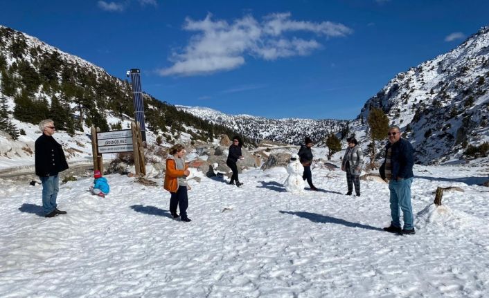 Antalya’yı Konya’ya bağlayan Akseki-Seydişehir karayolunun 1825 metre rakımlı Alacabel mevkiinde mola veren vatandaşlar kar keyfi yapıyor.