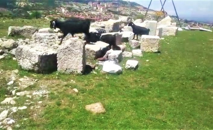 Denizli’nin Kale ilçesinde yüzlerce yıllık geçmişi bulunan Tabea Antik Kenti’nde koyunların otladığını görenler şaşkınlıklarını gizleyemezken, hayvanlarını tarihi sütunlarla birlikte tarihi eserlerin arasında otlatan çoban, Süleyman Yıldız “Hayvan tarihi eser yemez, biz buranın bir nevi bekçiliğini yapıyoruz” diyerek olaya farklı bir yorum getirdi.