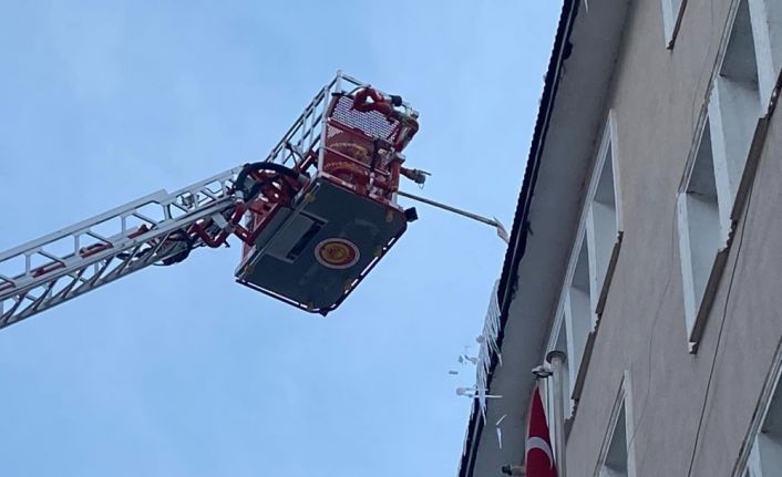 Ardahan’da itfaiye ekipleri, çatılarda oluşan buz sarkıtlarını kırarak olası kazaları engelliyor.