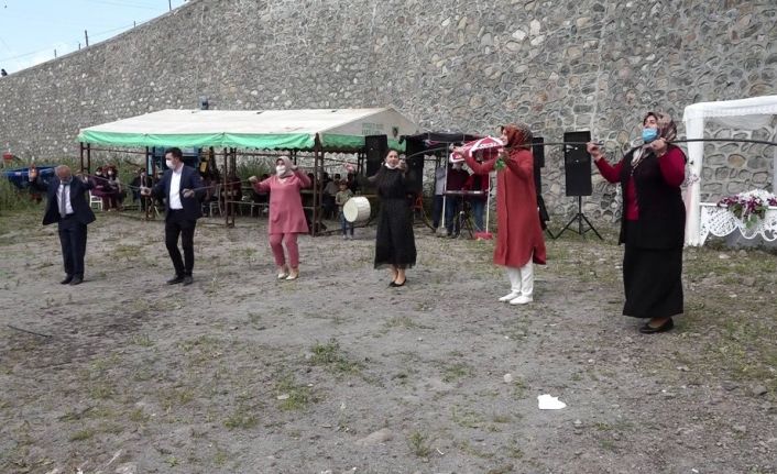Takıların sandığa bırakıldığı düğünde davetliler ayrılınca gelin ve damadın yakın akrabaları maskelerini çıkarmadan sosyal mesafe çubuklarıyla halay çekerek günü sonlandırdı.