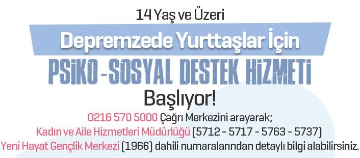 Ülkemizi derinden sarsan depremin toplum üzerinden oluşturduğu psikolojik travmanın etkilerini azaltmak adına desteğe ihtiyaç duyan 14 yaş ve üzeri yurttaşlar, Ataşehir Belediyesi’nin 0216 570 5000 Çağrı Merkezi’ni, Kadın ve Aile Hizmetleri Müdürlüğü’nün (5712 - 5717 5763 - 5737) ile Yeni Hayat Gençlik Merkezi’nin (1966) dahili numaralarından detaylı bilgi alarak randevu oluşturabilecek.