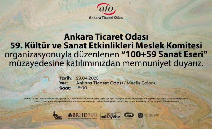 Ankara Ticaret Odası’nın (ATO) 59 No’lu Kültür ve Sanat Etkinlikleri Meslek Komitesi organizasyonuyla “100+59 Sanat Eseri” Bağış Müzayedesi, 29 Nisan Cumartesi günü ATO Meclis Toplantı Salonu’nda gerçekleştirilecek. Müzayededen elde edilecek gelirin tamamı ATO’nun deprem bölgesine 100+ Kalıcı Konut kazandırmak üzere başlattığı “Ayın Yıldızıyım” temalı bağış çağrısına aktarılacak.