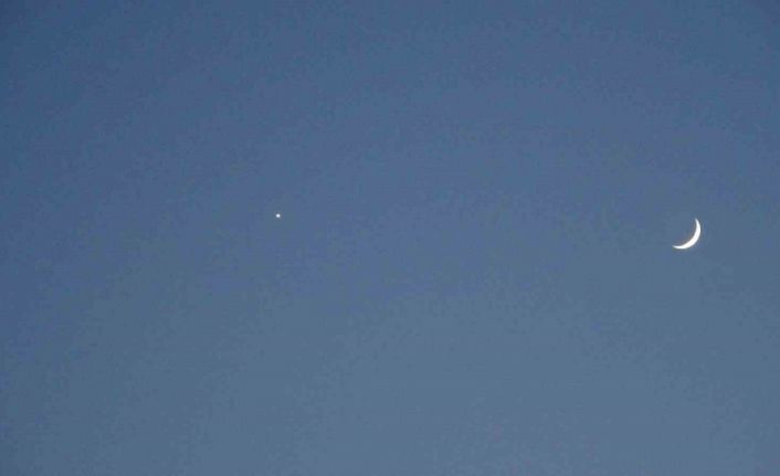 Akşam saatlerinde açık gökyüzünde gözlemlenebilen hilal şeklindeki ay ile yıldızın gökyüzünde buluşması akıllara Türk bayrağını getirdi.