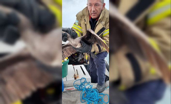 Balıkesir’in Ayvalık ilçesinde, rıhtıma bağlı bir balıkçı sandalındaki misinalara dolanarak mahsur kalan karabatak kuşunu itfaiye ekipleri kurtardı.