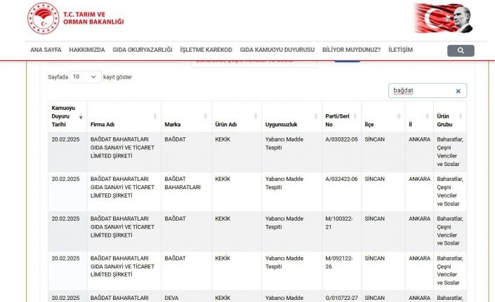 Bağdat Baharatları markasının ’kekik’ ürününde yabancı madde tespit edildi.