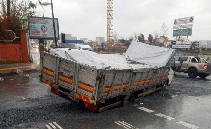 Olay Bahçelievler Nevzat Pisak Caddesi üzerinde 14:30 sıralarında meydana geldi. İSKİ tarafından cadde üzerinde geçtiğimiz günlerde yapılan kazı çalışmasının ardından kazılan yerler mıcır ile kapatıldı. Ancak İstanbul’da dün gece saatlerinden itibaren etkili olan yağış nedeniyle yolda çökme meydana geldi. Bu sırada yoldan geçmekte olan bir kamyonet çökme sonucu oluşan çukura düşerek mahsur kaldı. Kendi imkanlarıyla aracını kurtarmaya çalışan kamyon şoförü başarılı olamayınca belediye ekiplerine haber verdi.