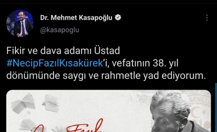 Gençlik ve Spor Bakanı Dr. Mehmet Muharrem Kasapoğlu, sosyal medya hesabından yaptığı bir paylaşımla 38 yıl önce vefat eden Şair Necip Fazıl Kısakürek’i andı.