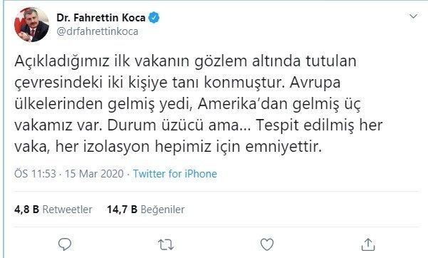 Sağlık Bakanı Koca, sosyal medya hesabından yaptığı açıklamada, ”Açıkladığımız ilk vakanın gözlem altında tutulan çevresindeki 2 kişiye tanı konmuştur. Avrupa ülkelerinden gelmiş 7, Amerika’dan gelmiş 3 vakamız var. Durum üzücü ama tespit edilmiş her vaka, her izolasyon hepimiz için emniyettir” dedi.