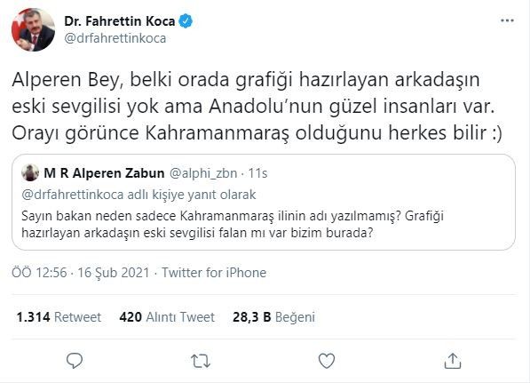 Sağlık Bakanı Fahrettin Koca, 81 ilin vaka tablosunda Kahramanmaraş’ın ismine yer verilmemesi üzerine "Grafiği hazırlayan arkadaşın eski sevgilisi falan mı var bizim burada" diye soran vatandaşa, "Orada eski sevgilisi yok ama Anadolu’nun güzel insanları var" şeklinde esprili cevap verdi.