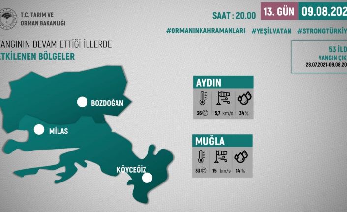 Bakanın paylaşımına göre, orman yangınlarının 13’üncü gününde Muğla’nın Köyceğiz ve Milas ilçesi ile Aydın’ın Bozdoğan ilçesindeki orman yangınlarını kontrol altına alma çalışması sürüyor. Yangınlara, 15 uçak, 64 helikopter, 9 İHA, 1 insansız helikopter, 850 arazöz, 430 iş makinesi ve 5 bin 250 personel ile müdahale ediliyor.