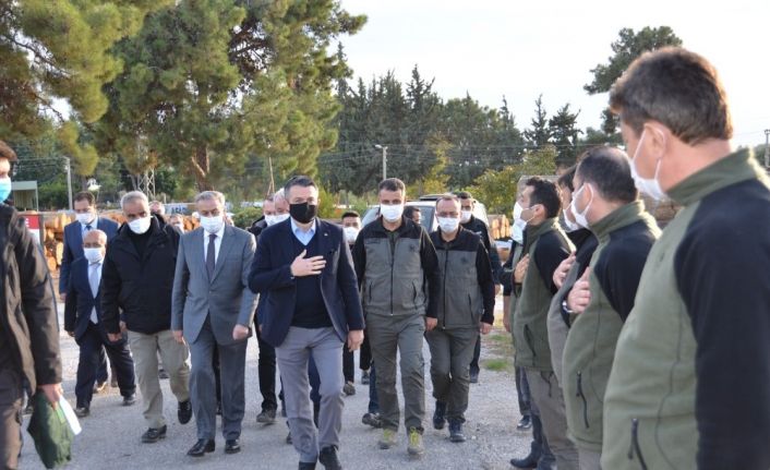 Orman Bölge Müdürlüğünden dün gerçekleştirilen ziyarete ilişkin yapılan açıklamada, helikopterle Kuyuluk Orman Deposuna gelen Bakan Pakdemirli’yi, Mersin Valisi Ali İhsan Su, Orman Bölge Müdürü Kenan Akduman ile bölge müdürlüğü yetkililerinin karşıladığı bildirildi. Ziyaret sırasında Bölge Müdürü Akduman tarafından Bakan Pakdemirli’ye, çalışmalarla ilgili bilgi verildiği kaydedildi.Bakan Pakdemirli Mersin’de incelemelerde bulundu