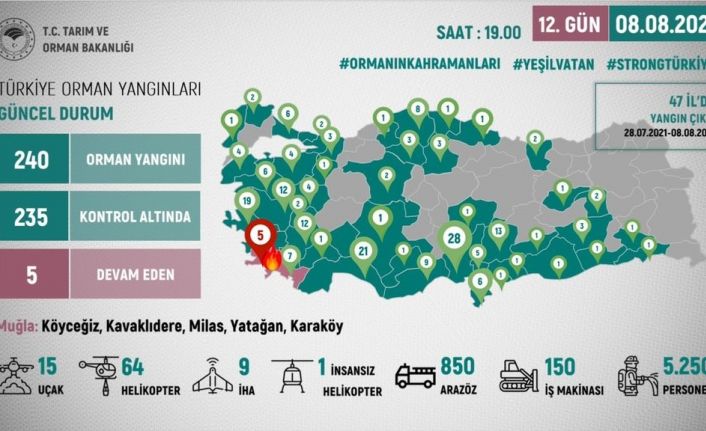 Bakan Pakdemirli sosyal medya hesabından yaptığı paylaşımda, "Orman yangınları ile mücadelemiz 12 gündür Orman Kahramanaları’nın cansiparane çalışmaları ile devam ediyor. 47 İlimizde çıkan 240 orman yangınının 235’ini kontrol altına aldık ve Muğla’da devam etmekte olan 5 yangını da kontrol altına almak için tüm gücümüzle çalışıyoruz” dedi.