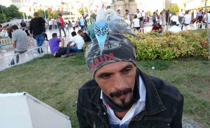 İstanbul Taksim’de kafasının üstündeki 3 muhabbet kuşuyla gezen vatandaş, ilgi odağı oldu. Kuşları bir an olsun bile yanından ayırmayan vatandaşı gören yerli ve yabancı turistler şaşkınlıklarını gizleyemedi.