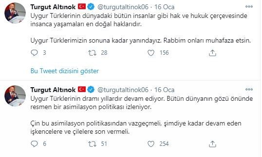 Altınok, Uygur Türklerinin yanında olmaya devam edeceklerini kaydettiği mesajında şu ifadelere yer verdi: