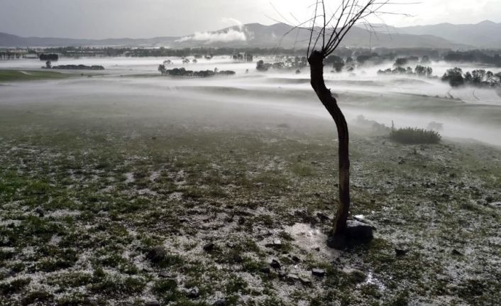 Yaklaşık 5 dakika süren yağışın ardından ekili araziler beyaza büründü.