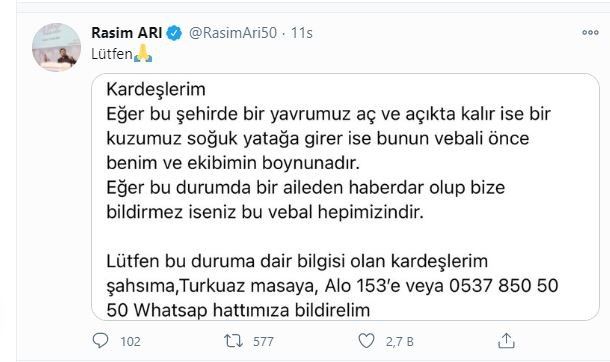 Nevşehir Belediye Başkanı Rasim Arı içerisinde bulunduğumuz kış mevsimi nedeniyle sosyal medya hesabından Nevşehir halkına çağrıda bulunarak, "Bu şehirde bir yavrumuz aç ve açıkta kalırsa lütfen bu durumu bize bildirin" dedi. Belediye Başkanı Arı sosyal medya hesabından yaptığı paylaşımda, “Kardeşlerim, Eğer bu şehirde bir yavrumuz aç ve açıkta kalır ise bir kuzumuz soğuk yatağa girer ise bunun vebali önce benim ve ekibim boynunadır. Eğer bu durumda bir aileden haberdar olup bize bildirmez iseniz bu vebal hepimizindir. Lütfen bu durumdan bilgisi olan kardeşlerim, şahsıma, Turkuaz masaya, Alo 153’e veya 0537 850 50 50 whatsapp hattımıza bildirelim” sözlerini paylaştı.