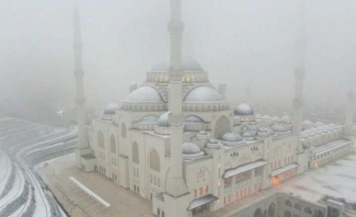 Beyaz örtüye bürünen Çamlıca Camii sabahın ilk ışıkları ile havadan görüntülendi