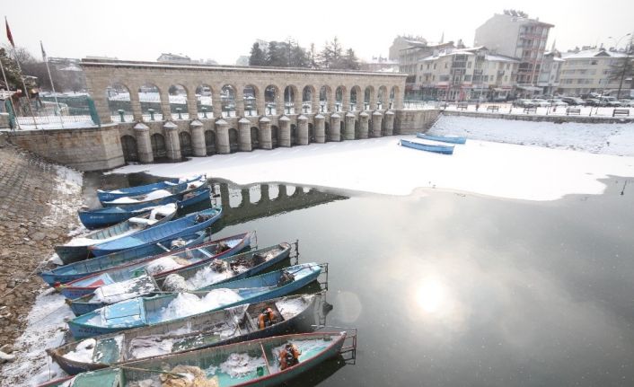 Beyşehir’de başlayan kar yağışı Türkiye’nin en büyük tatlı su gölüne kıyısı bulunan ilçe merkezinde kartpostallık görüntüler oluşturdu. Kar yağışıyla birlikte tarihi Taşköprü önündeki buz tabakasının üzeri beyaz örtüyle kaplandı. Kar örtüsü, balıkçı tekneleriyle birlikte görenlerin ilgisini çeken manzaralar oluşmasına yol açtı.