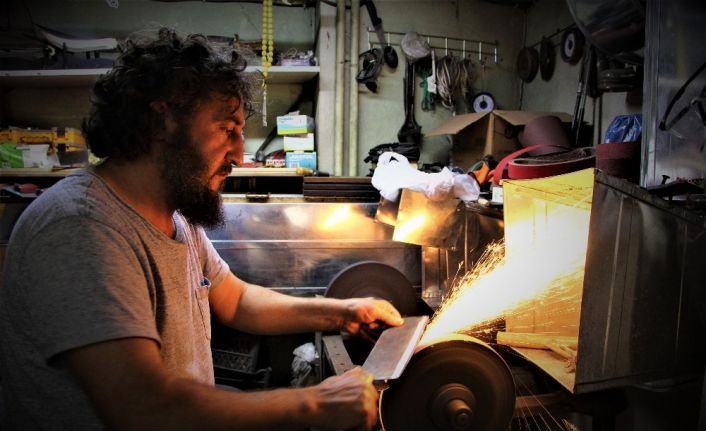 Ülke genelinde olduğu gibi Elazığ’da da Kurban Bayramı nedeniyle çarşılarda yoğunluk başladı. Bayramın yaklaşması ile birlikte kurban kesecek vatandaşlar, bıçak ve satır gibi aletlerini biletmek için ustaların yolunu tuttu. Bıçak satıcıları ve bileyicileri de tam mesai ile artan talepleri karşılamaya çalışıyor. Kaliteli kurbanlık bıçak fiyatlarının 35 ile 50 TL arasında değiştiğini ifade eden 16 yıllık bileme ustası Turan Kehya, Elazığ’da yaşanan deprem ve akabinde tüm dünyayı ve ülkemizi etkisi altına korona virüs salgını nedeniyle bilemede geçen seneki fiyat üzerinden 4 TL aldıklarını belirtti. Yoğun bir mesai harcadıklarını ve gelen siparişlere yetişmekte güçlük çektiklerini belirten Kehya, “16 yıldır bu mesleği, bıçak bileme ve imalatını yapıyorum. Kurban Bayramı sebebiyle yoğunluk var. Şu anda gece gündüz demeden çalışmaya devam ediyoruz. Köylerden geleni de var, ilçelerden geleni de. Herkes burayı biliyor ve şu an çok yoğunuz. Sabah saat 7 gibi geliyoruz, işin yoğunluğuna göre bazen gece bire kadar çalışıyoruz” dedi.