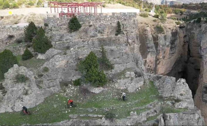 Bölgenin tanıtımı için önemli rol oynayan kanyonda bisiklet sporcularının tehlikeli sürüşü dron pilotu Şafak Aksoy tarafından görüntülendi.